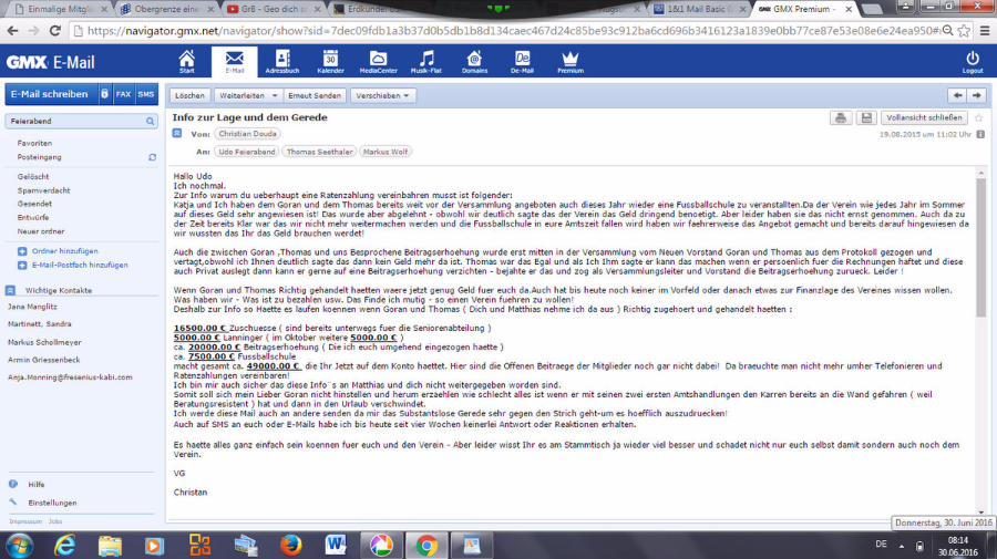 Wenn Goran und Thomas Richtig gehandelt haetten waere jetzt genug Geld fuer euch da.Auch hat bis heute noch keiner im Vorfeld oder danach etwas zur Finanzlage des Vereines wissen wollen. Was haben